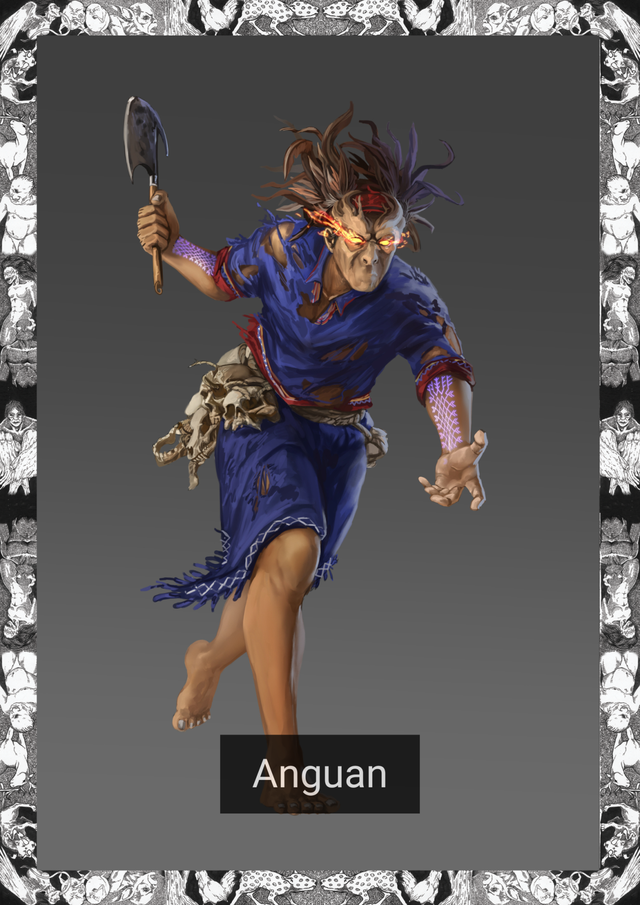 The Anguan is a spirit capable of traversing the layers of the many worlds. It wanted more power, enough to fell the lightning dog. It was thus that it traveled to the lower worlds. Known by all spirits, there was a rivalry between the courts of the Skyworld and the Lower Worlds.